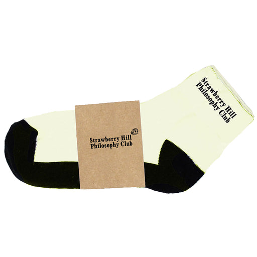 Hockey Socks in White 75% Cotton/ 20% Polyester/ 3% Nylon/ 2% Elastic "HOCKEY" Art Woven on side Jacquard pattern on side One Size Fits All