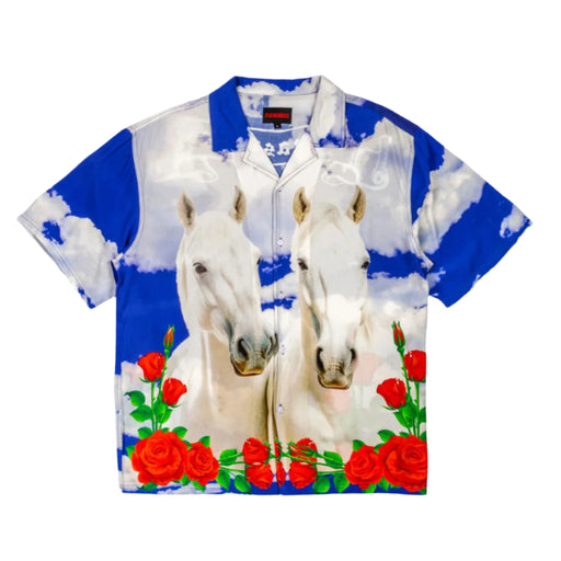 Pleasures White Horse Button Up in Blue Camp Collar Short Sleeve Button Down100% Rayon ChallisAll over reactive print
